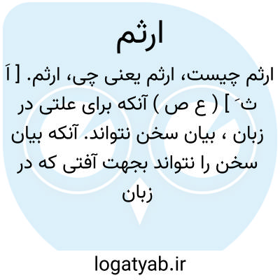 ارثم. [ اَ ث َ ] ( ع ص ) آنکه برای علتی در زبان، بیان سخن نتواند. آنکه بیان سخن را نتواند بجهت آفتی که در زبان دارد. ( منتهی الارب ): بیانک عن الارثم صدقة. ( حدیث ). || اسب سربینی سپید یا سپیدلب بالائین.( منتهی الارب ). اسب که در لب زبرین او سپیدی باشد. لب بالاسپید ( اسب ). مقابل المظ. || گوسپند که سربینی سیاه و سایر تن سپید دارد. مؤنث: رَثماء.