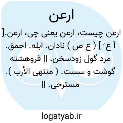 ارعن.[ اَ ع َ ] ( ع ص ) نادان. ابله. احمق. مرد گول زودسخن. || فروهشته گوشت و سست. ( منتهی الأرب ). مسترخی. || دراز بی عقل. احمق دراز. دراز احمق. ( زمخشری ). مؤنث: رَعْناء. || جیش ارعن؛ لشکر گران بسیار. ( منتهی الأرب ). آن لشکر که بپاره کوه ماند. ( مهذب الاسماء ). لشکر کوهی. سپاهی گران.جیش عظیم. || ( ن تف ) نعت تفضیلی از رعن.