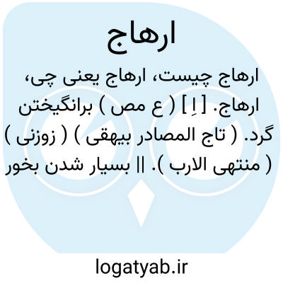 لغت نامه دهخدا ارهاج. [ اِ ] ( ع مص ) برانگیختن گرد. ( تاج المصادر بیهقی ) ( زوزنی ) ( منتهی الارب ). || بسیار شدن بخور خانه. ( منتهی الارب ):ارهج؛ اذا کثر بخور بیته. ( تاج العروس ). || ارهاج سماء؛ باریدن گرفتن آسمان. ( منتهی الارب ).