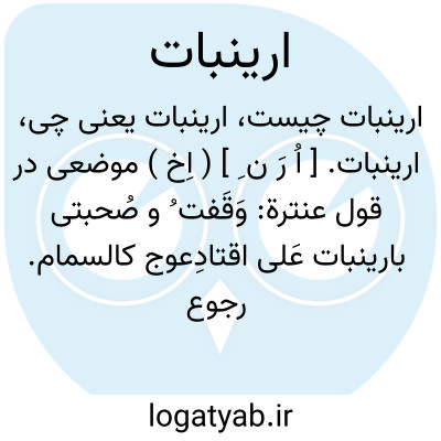 لغت نامه دهخدا ارینبات. [ اُ رَ ن ِ ] ( اِخ ) موضعی در قول عنترة:وَقَفت ُ و صُحبتی بارینبات عَلی اقتادِعوج کالسمام.رجوع به معجم البلدان شود.