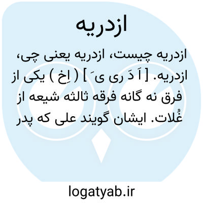 ازدریه. [ اَ دَ ری ی َ ] ( اِخ ) یکی از فرق نه گانه فرقه ثالثه شیعه از غُلات. ایشان گویند علی که پدر حسنین است علی امام نیست بلکه مردی است که او را علی الأزدری گویند و آن علی که امام است او را فرزند نباشد. ( بیان الادیان ).