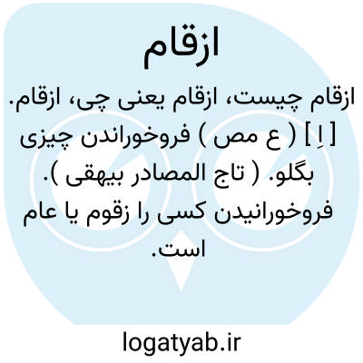 ازقام. [ اِ ] ( ع مص ) فروخوراندن چیزی بگلو. ( تاج المصادر بیهقی ). فروخورانیدن کسی را زقوم یا عام است. ( منتهی الارب ).