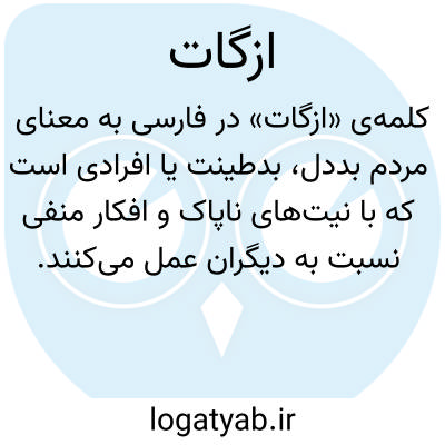 کلمهی «ازگات» در فارسی به معنای مردم بددل، بدطینت یا افرادی است که با نیتهای ناپاک و افکار منفی نسبت به دیگران عمل میکنند. این واژه در متون قدیمی و ادبی فارسی به کار رفته و برای توصیف افرادی استفاده میشود که خصایل اخلاقی منفی دارند و ممکن است به دیگران آسیب برسانند یا درصدد خرابکاری و سوءنیت باشند. ازگات معمولاً رفتاری خصمانه، حسادتآمیز یا فریبکارانه دارند و قابل اعتماد نیستند. در ادبیات فارسی، این واژه برای هشدار دادن نسبت به افراد بدخواه و بداندیش به کار میرود و بار اخلاقی و اجتماعی قوی دارد. از نظر معنایی، ازگات با مفاهیمی مانند بددل، خبیث، ناپاک، فریبکار و خصمجوی هممعنی است. شناخت چنین افرادی برای حفظ روابط اجتماعی سالم و جلوگیری از آسیبهای احتمالی اهمیت دارد. در مکالمات روزمره کمتر استفاده میشود اما در متون ادبی و تاریخی کاربرد دارد.