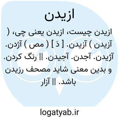 ( آزیدن ) آزیدن. [ دَ ] ( مص ) آژدن. آژیدن. آجدن. آجیدن. || رنگ کردن. و بدین معنی شاید مصحف رزیدن باشد. || آزار دادن. آزردن. ( برهان ).
