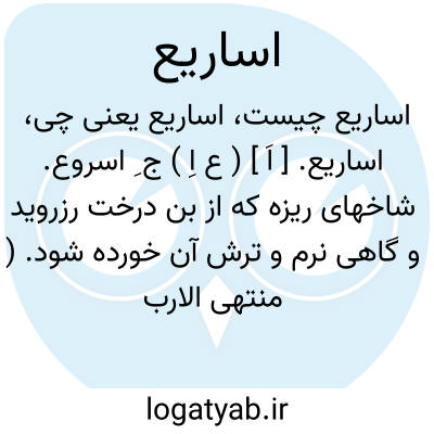 اساریع. [ اَ ] ( ع اِ ) ج ِ اسروع. شاخهای ریزه که از بن درخت رزروید و گاهی نرم و ترش آن خورده شود. ( منتهی الارب ). || آب داری دندان و درخشندگی آن. ( منتهی الارب ): ثغر ذواساریع. || خطوط و نشانهای کمان. ( منتهی الارب ). || پاره های سیم و زر گداخته: الحدیث فی صفةالنّبی ( ص ): کان عنقه اساریعالذهب؛ ای سبائکه. ( منتهی الارب ). || کرمک هاست سپیدرنگ سرخ سر، که در ریگ و وادی ظبی یافت شود. و بدان انگشت های زنان را تشبیه کنند. ( از منتهی الارب ).
