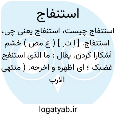 لغت نامه دهخدا استنفاج. [ اِ ت ِ ] ( ع مص ) خشم آشکارا کردن. یقال: ما الذی استنفج غضبک؛ ای اظهره و اخرجه. ( منتهی الارب ).