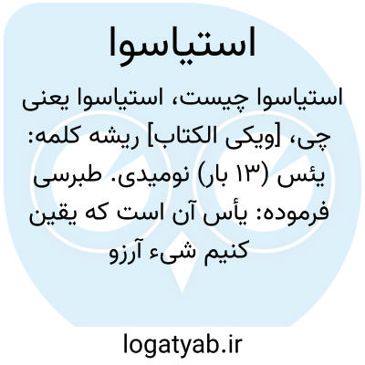 نومیدی. طبرسی فرموده: یأس آن است که یقین کنیم شی‏ء آرزو شده بدست نخواهد آمد. راغب گوید:. امروز کفار از دین شما مأیوس شدند. یعنی طمع بریدند از اینکه شما از دینتان دست بردارید.. از رحمت خدا ناامید نباشید. استیئاس: مثل یأس است. چون از یوسف ناامید شدند که برادرشان را آزاد کند کنار رفتند و با هم نجوی می‏کردند. *. یأس را در آیه علم معنی کرده‏اند در جوامع الجامع می‏گوید: علت این امر آن است که یأس معنای علم را در ضمن گرفته زیرا مأیوس شونده می‏داند که اینکار نخواهد شد. راغب نیز نزدیک به آن گفته است یعنی: آیا اهل ایمان ندانستند که اگر خدا می‏خواست همه مردم را هدایت می‏کرد. *. یؤس و قنوط هر دو به یک معنی اند یعنی انسان از طلب خیر خسته نمی‏شود و اگر ضرری به او رسد بسیار ناامید و مأیوس است.