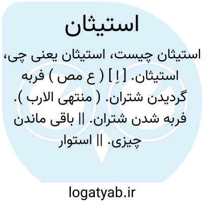 استیثان. [ اِ ] ( ع مص ) فربه گردیدن شتران. ( منتهی الارب ). فربه شدن شتران. || باقی ماندن چیزی. || استوار گردیدن چیزی. || بسیار ورزیدن مال را. یقال: استوثن من المال؛ ای استکثر منه. || دو فرقه گردیدن خرمابنان، یعنی خرد و کلان. ( منتهی الارب ). بزرگ و خرد بودن خرمابنان. || در پی رفتن شترکرگان شتران را. پی رو شتران شدن شتربچگان. ( منتهی الارب ).