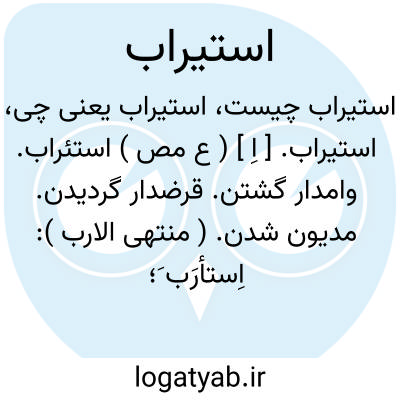استیراب. [ اِ ] ( ع مص ) استئراب. وامدار گشتن. قرضدار گردیدن. مدیون شدن. ( منتهی الارب ): اِستأرَب َ؛ استدان. ( قطر المحیط ). || مداجاة. مدارا کردن. || مغالطه. ( از قطر المحیط ).