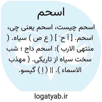 اسحم. [ اَ ح َ ] ( ع ص ) سیاه. ( منتهی الارب ): اسحم داج؛ شب سخت سیاه از تاریکی. ( مهذب الاسماء ). || ( اِ ) گیسو. موی سیاه. || شب. || خونی که در آن سوگندخوران دست خود را غوطه دهند. خونی که هم سوگندان در آن دست فروزدندی. || ابر. || سرپستان. || سیاهی سرپستان. || زهدان. || خیک می. ( منتهی الارب ). خیک شراب. || خیک آب. مشک.