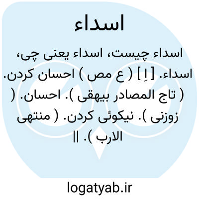 اسداء. [ اِ ] ( ع مص ) احسان کردن. ( تاج المصادر بیهقی ). احسان. ( زوزنی ). نیکوئی کردن. ( منتهی الارب ). || فروگذاشتن. ( تاج المصادر بیهقی ). بخودگذاشتن، چنانکه شتر را. ( از منتهی الارب ). || فرت بافتن. ( تاج المصادر بیهقی ). زود دربافتن. || بافتن، چنانکه جامه را. تار بافتن. || اصلاح کردن بین دو کس. اصلاح میان دو تن. || سست و فروهشته شدن غلاف غوره خرما. ( منتهی الارب ). || نرم شدن دنباله غوره خرما.