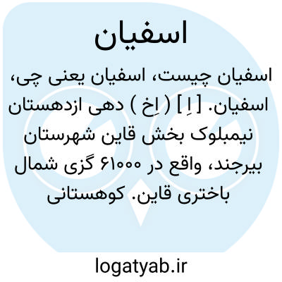 اسفیان. [ اِ ] ( اِخ ) دهی از دهستان کمهروکاکان بخش اردکان شهرستان شیراز واقع در 42000 گزی شمال اردکان و 16000 گزی شوسه اردکان به تل خسروی. کوهستانی. سردسیر و مالاریائی. دارای 464 تن سکنه. فارسی و لری زبان. آب آن از چشمه. محصول آن غلات، حبوبات، تریاک. شغل اهالی زراعت. راه آن مالرو است. ( فرهنگ جغرافیائی ایران ج 7 ). || دهی در دوازده فرسخی میانه شمال و شرق فهلیان. ( فارسنامه ناصری ). || دو فرسخ شمالی دوزه ( صیمکان فارس ). ( فارسنامه ناصری ).