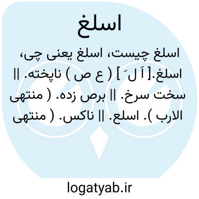 لغت نامه دهخدا اسلغ.[ اَ ل َ ] ( ع ص ) ناپخته. || سخت سرخ. || برص زده. ( منتهی الارب ). اسلع. || ناکس. ( منتهی الارب ). فرومایه. || لحم اسلغ؛ گوشت که زود نپزد. گوشت ناپزا. || گوشت ناپخته. ( منتهی الارب ). گوشتی خام. ( مهذب الاسماء ).