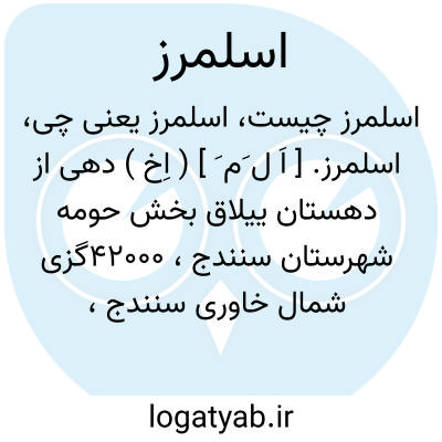 اسلمرز. [ اَ ل َم َ ] ( اِخ ) دهی از دهستان ییلاق بخش حومه شهرستان سنندج، 42000گزی شمال خاوری سنندج، 4000گزی شمال خاوری گمه دره. کوهستانی، سردسیر. سکنه 540 تن. سنی شافعی. آب آن از چشمه. محصول آن غلات. شغل اهالی زراعت و گله داری. راه مالرو دارد. صنایع دستی زنان، قالیچه، جاجیم و گلیم بافی است. ( فرهنگ جغرافیایی ایران ج 5 ).