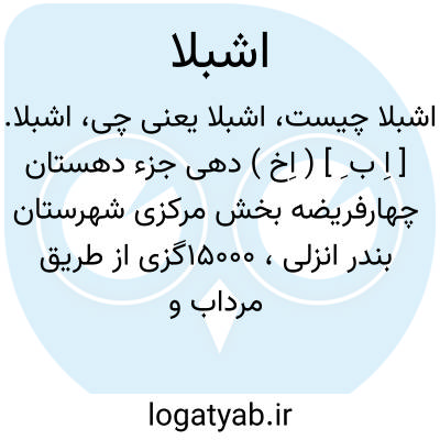 اشبلا. [ اِ ب ِ ] ( اِخ ) دهی جزء دهستان چهارفریضه بخش مرکزی شهرستان بندر انزلی، 15000گزی از طریق مرداب و 22000گزی از طریق خشکی کنار مرداب. مرطوب. معتدل. با 138 تن سکنه. گیلکی. آب آن از رود واویلا. محصول آن برنج، توتون، سیگار، ابریشم، صیفی کاری، ماهی. شغل اهالی زراعت و صیادی. راه آن مالرو است. با قایق به انزلی میتوان رفت. ( فرهنگ جغرافیائی ایران ج 2 ).