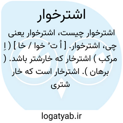اشترخوار. [ اُ ت ُ خوا / خا ] ( اِ مرکب ) اشترخار که خارشتر باشد. ( برهان ). اشترخار است که خار شتری باشد. ( آنندراج ). نام درختی است خرد خاردار که شتر را نیک فربه گرداند و از خار مانند شهد شیره بدرآید. ( هفت قلزم ). و رجوع به اشترغار و اشترغاز و اشترخار شود. || کنه و آن جانوری است کوچک و خونخوار که بر بدن شتر و گاو و خر و گوسفند بچسبد و خون از بدن آنها بمکد. ( برهان ) ( هفت قلزم ) ( آنندراج ). کرنه. کرته. اشترغاز. شترخوار. ( جهانگیری ). || نوعی از مار که آنرا اشترخوار میگویند. ( برهان ) ( هفت قلزم ) ( آنندراج ). و رجوع به شترخوار شود.