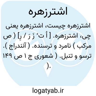 اشترزهره. [ اُ ت ُ زَ رَ / رِ] ( ص مرکب ) نامرد و ترسنده. ( آنندراج ). ترسو و تنبل. ( شعوری ج 1 ص 149 ). اشتردل. رجوع به اشتردل شود.
