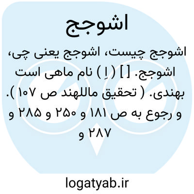 اشوجج. [ ] ( اِ ) نام ماهی است بهندی. ( تحقیق ماللهند ص 107 ). و رجوع به ص 181 و 250 و 285 و 287 و 288 و 291 همان کتاب شود.