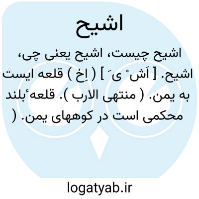 اشیح. [ اَش ْ ی َ ] ( اِخ ) قلعه ایست به یمن. ( منتهی الارب ). قلعه ٔبلند محکمی است در کوههای یمن. ( مراصد ). دژ استواری بود در یمن در قله کوهی بسیار بلند. ( از قاموس الاعلام ترکی ). نام حصن بسیار بلندیست در یمن... ( معجم البلدان ). و رجوع به همان کتاب ( چ مصر ج 1 ص 263 ) شود.