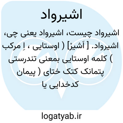 اشیرواد. [ اَشیرْ] ( اوستایی، اِ مرکب ) کلمه اوستایی بمعنی تندرستی پتمانک کتک ختای ( پیمان کدخدایی یا خطبه عروسی که نزد پارسیان هند به اسم گجراتی خود اشیرواد معروف است ). ( از خرده اوستا ص 28 ).