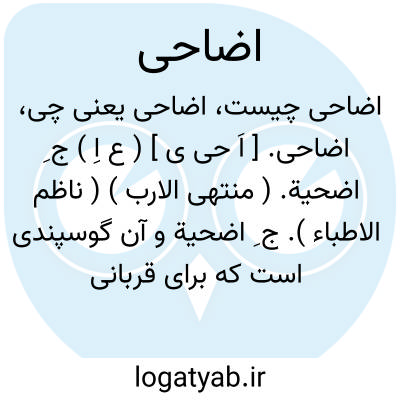 اضاحی. [ اَ حی ی ] ( ع اِ ) ج ِ اضحیة. ( منتهی الارب ) ( ناظم الاطباء ). ج ِ اضحیة و آن گوسپندی است که برای قربانی تهیه کنند. ( از اقرب الموارد ). قربانیها. و رجوع به اضحیة شود.