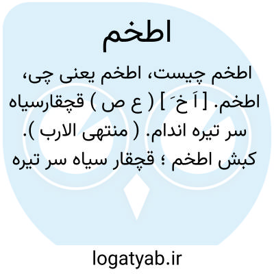 اطخم. [ اَ خ َ ] ( ع ص ) قچقارسیاه سر تیره اندام. ( منتهی الارب ). کبش اطخم؛ قچقار سیاه سر تیره اندام. ( ناظم الاطباء ). قچقار سیاه سر و تیره اندام. ( آنندراج ). بره ای که سر آن سیاه و دیگر اندامش کدر و تیره باشد. ( از اقرب الموارد ). || اسب که از کاکل تا دمش خط سیاه باشد. ( منتهی الارب ). فرس اطخم؛ اسبی که از کاکل تا دمش خط سیاه باشد. ( ناظم الاطباء ). دیزج. ( اقرب الموارد ). و آن معرب دیزه است بمعنی اسبی که از کاکل تا دمش خط سیاه داشته باشد. رجوع به دیزه و دیزج شود. || گوشت خشک که بسیاهی زند. ( منتهی الارب ) ( ناظم الاطباء ) ( از اقرب الموارد ). طَخیم. رجوع به طَخیم شود. || ( اِ ) نوک بینی مردم و ستور. ( منتهی الارب ) ( ناظم الاطباء ). مقدم بینی انسان و دابه. ( از اقرب الموارد ).