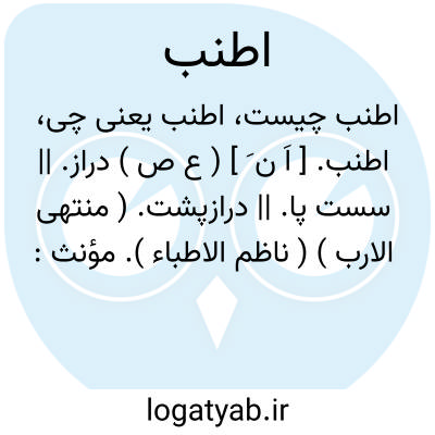 اطنب. [ اَ ن َ ] ( ع ص ) دراز. || سست پا. || درازپشت. ( منتهی الارب ) ( ناظم الاطباء ). مؤنث: طَنْباء. ( منتهی الارب ).