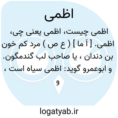 اظمی. [ اَ ما ] ( ع ص ) مرد کم خون بن دندان، یا صاحب لب گندمگون. و ابوعمرو گوید: اظمی سیاه است، و رمح اظمی نیزه باریک سیاه. ( منتهی الارب ) ( ناظم الاطباء ) ( از آنندراج ). سیاه فام لب. مؤنث: ظَمْیاء. ( مهذب الاسماء ). سیه لب. باریک لب.گندمگون و باریک. مؤنث: ظَمْیاء. ج، ظُمْی: سایه َظْمی ̍؛ سایه سیاه. و نیزه اظمی؛ نیزه گندمگون. ( از اقرب الموارد ). نیزه گندمگون باریک. نیزه و سایه سیاه. ( از متن اللغة ). و ثعالبی این کلمه را در ذیل لواحق سیاه آورده است. رجوع به فقه اللغة ص 45 شود.