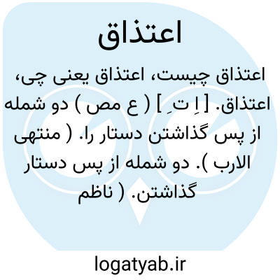لغت نامه دهخدا اعتذاق. [ اِ ت ِ ] ( ع مص ) دو شمله از پس گذاشتن دستار را. ( منتهی الارب ). دو شمله از پس دستار گذاشتن. ( ناظم الاطباء ). || خاص کردن کسی را به چیزی. || نشان کردن شتر را برای گرفتن. ( از منتهی الارب ) ( ناظم الاطباء ).