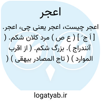 لغت نامه دهخدا اعجر. [ اَ ج َ ] ( ع ص ) مرد کلان شکم. ( آنندراج ). بزرگ شکم. ( از اقرب الموارد ) ( تاج المصادر بیهقی ) ( المصادر زوزنی ): رجل اعجر؛ مرد کلان شکم. ( منتهی الارب ) ( ناظم الاطباء ). || پرحجم. ( از اقرب الموارد ). || کیسه پر. ( آنندراج ) ( تاج المصادر بیهقی ). سخت پر. ( از اقرب الموارد ): همیان اعجر؛ کیسه پر. ( منتهی الارب ) ( ناظم الاطباء ) ( از اقرب الموارد ). || گشن درشت. ( آنندراج ). درشت و ضخیم. ( ازاقرب الموارد ): فحل اعجر؛ گشن درشت. ( منتهی الارب ). مؤنث: عَجْراء. ( اقرب الموارد ). || ( اِخ )نام مردی. ( منتهی الارب ) ( ناظم الاطباء ) ( آنندراج ).
