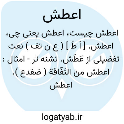 لغت نامه دهخدا اعطش. [ اَ طَ ] ( ع ن تف ) نعت تفضیلی از عَطَش. تشنه تر- امثال: اعطش من النَفّاقة ( ضفدع ). اعطش من النمل. ( از یادداشتهای مؤلف ). اعطش من ثعالة.اعطش من قمع.