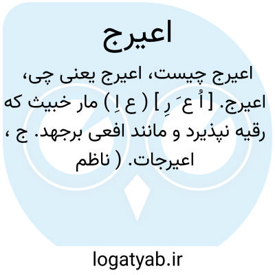 اعیرج. [ اُ ع َ رِ ] ( ع اِ ) مار خبیث که رقیه نپذیرد و مانند افعی برجهد. ج، اعیرجات. ( ناظم الاطباء ). مار که افسون نپذیرد و برجهد بر مردم. ج، اعیرجات. ( مهذب الاسماء نسخه خطی ). مصغراً ماری است خبیث که رقیه نپذیرد و مانند افعی برجهد. قال اللیث: لایؤنث. ج، اعیرجات. ( منتهی الارب ). || تصغیر اعرج. لنگ.