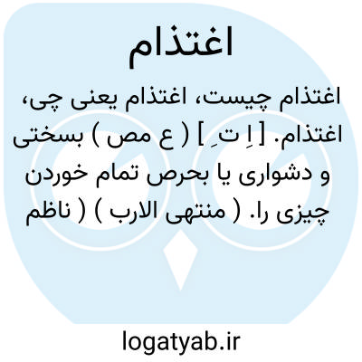 لغت نامه دهخدا اغتذام. [ اِ ت ِ ] ( ع مص ) بسختی و دشواری یا بحرص تمام خوردن چیزی را. ( منتهی الارب ) ( ناظم الاطباء ). با حرص یا بسختی و جفا خوردن چیزی را. ( از اقرب الموارد ). || همه شیر پستان را خوردن. ( منتهی الارب ) ( ناظم الاطباء ). خوردن شتربچه تمام شیر پستان مادر را: اغتذم الفصیل ما فی ضرع امه؛ شرب جمیعه. ( از اقرب الموارد ).
