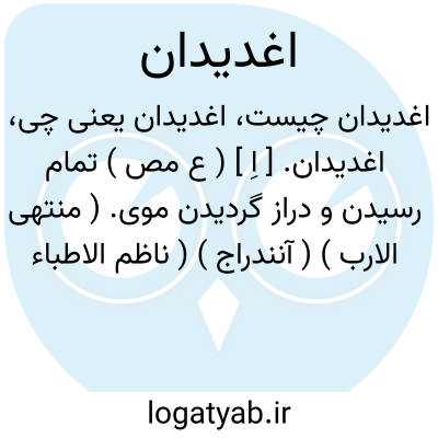 اغدیدان. [ اِ ] ( ع مص ) تمام رسیدن و دراز گردیدن موی. ( منتهی الارب ) ( آنندراج ) ( ناظم الاطباء ). دراز شدن و بکمال رسیدن موی. و منه: قامت ترائیک مغدودنا. ( از اقرب الموارد ). دراز شدن موی. ( المصادر زوزنی ). || سخت سبز شدن گیاه چنانکه از سیرابی بسیاهی زند: اغدودن النبت؛ اخضر یضرب الی السواد من شدة ریه. ( از اقرب الموارد ). تمام رسیدن و دراز گردیدن گیاه. ( منتهی الارب ) ( آنندراج ) ( ناظم الاطباء ).