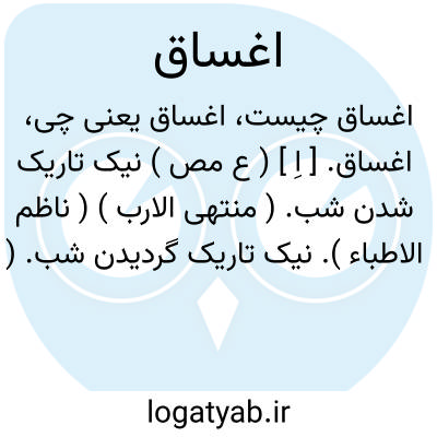 اغساق. [ اِ ] ( ع مص ) نیک تاریک شدن شب. ( منتهی الارب ) ( ناظم الاطباء ). نیک تاریک گردیدن شب. ( آنندراج ): اغسق اللیل؛ اشتدت ظلمته. ( از اقرب الموارد ). || در تاریکی درآمدن. ( منتهی الارب ) ( آنندراج ) ( ناظم الاطباء ). داخل شدن در تاریکی اول شب: اغسق فلان؛ دخل فی الغسق. ( از اقرب الموارد ). || بدرنگی بانگ نماز گفتن وقت مغرب. ( آنندراج ) ( منتهی الارب ). بدرنگی وقت مغرب بانگ نماز گفتن. ( ناظم الاطباء ).بتأخیر انداختن مؤذن مغرب را تا تاریکی اول شب: اغسق المؤذن؛ أخّر المغرب الی غسق اللیل. ( از اقرب الموارد ). نماز شام نیک تأخیر کردن. ( تاج المصادر بیهقی ). و فی الحدیث: کان الربیعبن جشم یقول لمؤذنه: یوم الغیم اغسق اغسق. ( منتهی الارب ) ( ناظم الاطباء ).