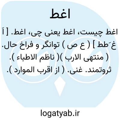 اغط. [ اَ غ َطط ] ( ع ص ) توانگر و فراخ حال. ( منتهی الارب )( ناظم الاطباء ). ثروتمند. غنی. ( از اقرب الموارد ).