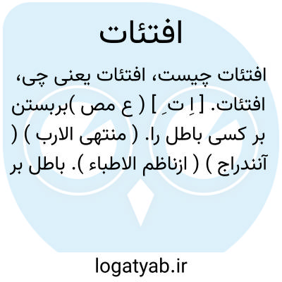 افتئات. [ اِ ت ِ ] ( ع مص )بربستن بر کسی باطل را. ( منتهی الارب ) ( آنندراج ) ( ازناظم الاطباء ). باطل بر کسی بربستن. ( از اقرب الموارد ). || کار کردن بخودرایی. ( منتهی الارب ) ( آنندراج ). برای خود کار کردن. ( ناظم الاطباء ). کار کردن برای خود. ( از اقرب الموارد ). || بناگاه مردن. ( منتهی الارب ) ( آنندراج ) ( از ناظم الاطباء ). ناگهانی مردن و بدین معنی بصیغه مجهول آید. یقال: افتئت فلان ( مجهولا )؛ ای مات فجاءة. ( از اقرب الموارد ).