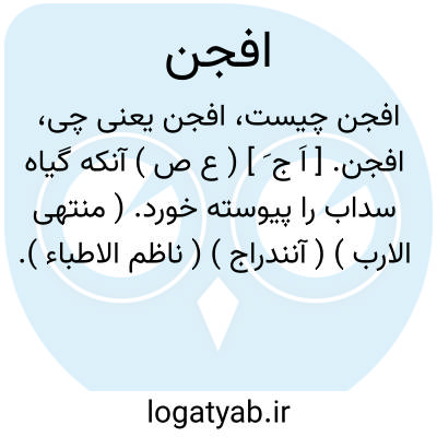 لغت نامه دهخدا افجن. [ اَ ج َ ] ( ع ص ) آنکه گیاه سداب را پیوسته خورد. ( منتهی الارب ) ( آنندراج ) ( ناظم الاطباء ).