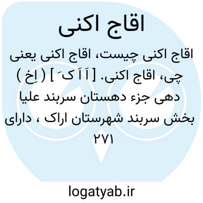 اقاج اکنی. [ اَ اَ ک َ ] ( اِخ ) دهی جزء دهستان سربند علیا بخش سربند شهرستان اراک، دارای 271 تن سکنه. آب آن از قنات و چشمه و محصول آن غلات، بنشن، پنبه، انگور و لبنیات است. ( از فرهنگ جغرافیایی ایران ج 2 ).