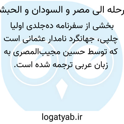 [ویکی نور] "الرحلة الی مصر و السودان و الحبشه" بخشی از سیاحتنامه ده جلدی جهانگرد مشهور اولیا چلپی است که حسین مجیب المصری آن را به عربی بازگردانده است. این اثر که در دو مجلد به چاپ رسیده است، در سیاحتنامه، بخشی از جلد نهم و تمام جلد دهم می باشد. این اثر از بهترین سفرنامه های دوره امپراتوری عثمانی است و درباره تاریخ، جغرافیا، رسوم و فرهنگ عامیانه سرزمین هایی که وی از آنها بازدید کرده است، اطلاعات گرانبهایی به دست می دهد.