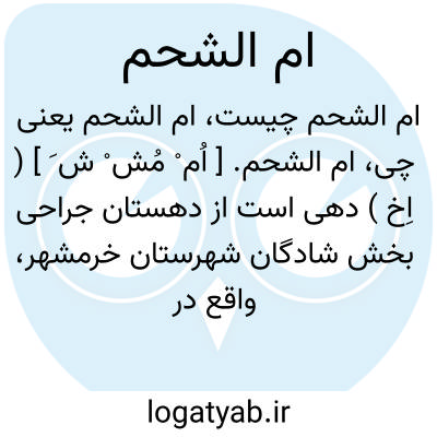 ام الشحم. [ اُم ْ مُش ْ ش َ ] ( اِخ ) دهی است از دهستان جراحی بخش شادگان شهرستان خرمشهر، واقع در 53 هزارگزی خاور شادگان و 5 هزارگزی باختری راه بندر معشوربه شادگان. در دشت واقع شده و گرمسیر است و 40 تن سکنه دارد. آب آن از چاه تأمین میشود. محصولش غلات و شغل مردم کشاورزی و گله داری است. ساکنان آن از طایفه آلبوغبیش هستند. ( از فرهنگ جغرافیایی ایران ج 6 ).