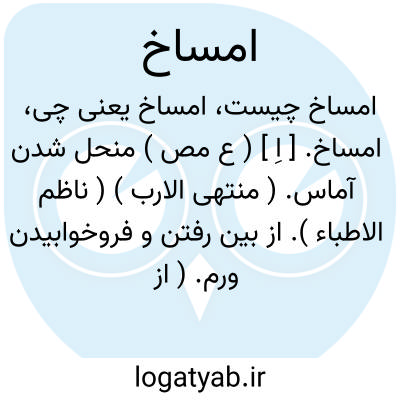 امساخ. [ اِ ] ( ع مص ) منحل شدن آماس. ( منتهی الارب ) ( ناظم الاطباء ). از بین رفتن و فروخوابیدن ورم. ( از اقرب الموارد ) ( از المنجد ).