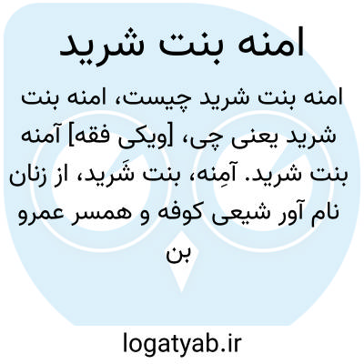 [ویکی فقه] آمنه بنت شرید. آمِنه، بنت شَرید، از زنان نام آور شیعی کوفه و همسر عمرو بن حَمِق خُزاعی (د ۵۰ق/۶۷۰م) بود.