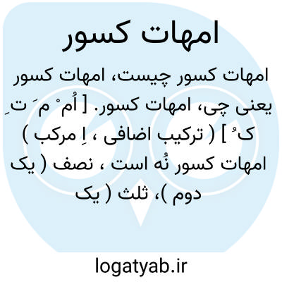 امهات کسور. [ اُم ْ م َ ت ِ ک ُ ] ( ترکیب اضافی، اِ مرکب ) امهات کسور نُه است، نصف ( یک دوم )، ثلث ( یک سوم )، ربع ( یک چهارم )، خمس ( یک پنجم )، سدس ( یک ششم )، سبع ( یک هفتم )، ثمن ( یک هشتم )، تسع ( یک نهم )، عشر ( یک دهم ). ( از دستورالعلماء ج 1 ص 187 ).