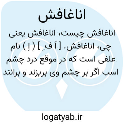 اناغافش. [ اَ ف ِ ] ( اِ ) نام علفی است که در موقع درد چشم اسب اگر بر چشم وی بریزند و برانند درحال دردرا دفع میکند. ( از فرهنگ شعوری ج 1 ورق 112 الف ).
