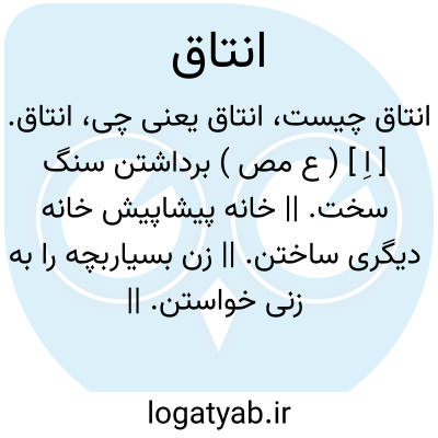 انتاق. [ اِ ] ( ع مص ) برداشتن سنگ سخت. || خانه پیشاپیش خانه دیگری ساختن. || زن بسیاربچه را به زنی خواستن. || سایبانی برگرفتن پیش آفتاب. ( منتهی الارب ) ( ناظم الاطباء ) ( آنندراج ) ( از اقرب الموارد ). || افشاندن انبان و خنور را تا از کرم پاک شود. ( منتهی الارب ) ( ناظم الاطباء ) ( آنندراج ). افشاندن انبان تا از سوس ( کرم ) پرداخته شود. ( از اقرب الموارد ). || روزه داشتن ماه رمضان را. ( منتهی الارب ) ( ناظم الاطباء ) ( از آنندراج ) ( از اقرب الموارد ).