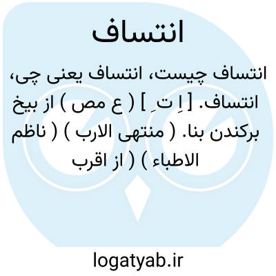 انتساف. [ اِ ت ِ ] ( ع مص ) از بیخ برکندن بنا. ( منتهی الارب ) ( ناظم الاطباء ) ( از اقرب الموارد ) ( از آنندراج ). برکندن. ( مصادر زوزنی ). || از بن برکندن شتر گیاه را. ( منتهی الارب ) ( ناظم الاطباء ) ( از اقرب الموارد ) ( آنندراج ). || رندیدن باد خاک را از زمین. ( از منتهی الارب ) ( ناظم الاطباء ) ( از آنندراج ). برداشتن باد چیزی را از زمین و پراکندن. ( از المنجد ). || تمام ناکردن سخن را. || آهسته سخن گفتن از ترس. ( از منتهی الارب ) ( ناظم الاطباء ) ( از آنندراج ). || برکندن مرغ چیزی را از روی زمین. ( اقرب الموارد ). || برگردانیدن رنگ، یستعمل مجهولاً. ( منتهی الارب ). اُنتسف لونه ( مجهولاً )؛ برگردید رنگ آن. ( ناظم الاطباء ) ( از اقرب الموارد ).
