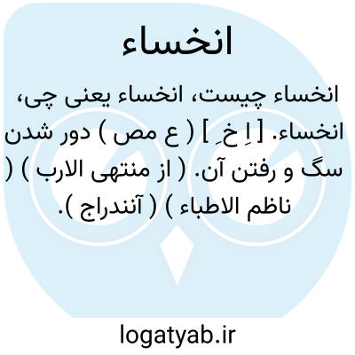 انخساء. [ اِ خ ِ ] ( ع مص ) دور شدن سگ و رفتن آن. ( از منتهی الارب ) ( ناظم الاطباء ) ( آنندراج ). دور شدن. ( تاج المصادر بیهقی ) ( مصادر زوزنی ). یقال: انخساءالکلب. ( از منتهی الارب ) ( ناظم الاطباء ).