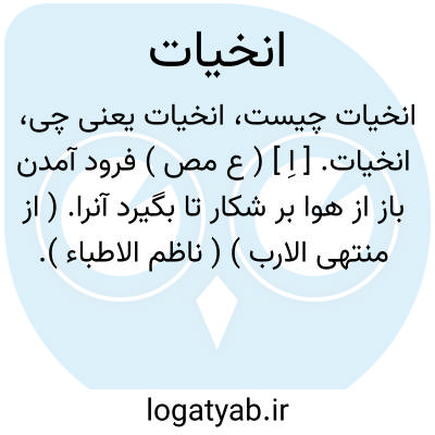 انخیات. [ اِ ] ( ع مص ) فرود آمدن باز از هوا بر شکار تا بگیرد آنرا. ( از منتهی الارب ) ( ناظم الاطباء ). فرود آمدن باز از هوا بر شکار. ( از اقرب الموارد ). فرود آمدن باز از هوا تا بگیرد شکار را. ( آنندراج ).