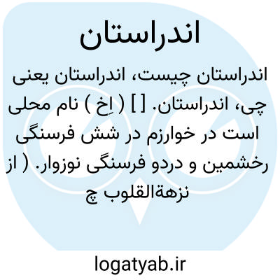 اندراستان. [ ] ( اِخ ) نام محلی است در خوارزم در شش فرسنگی رخشمین و دردو فرسنگی نوزوار. ( از نزهةالقلوب چ لیدن ص 180 ).
